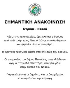 Κλειστός ο δρόμος από Ντράφι προς Νταού Πεντέλη λόγω κατολισθήσεων και φερτών υλικών στο ρέμα