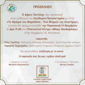 Εκδήλωση Ελεύθερου Πανεπιστημίου Δήμου Πεντέλης με τίτλο: ‘To Φράγμα του Μαραθώνα – ένα Μνημείο της Επιστήμης’