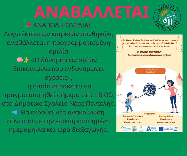 ΚΛΕΙΣΤΑ ΤΑ ΣΧΟΛΕΙΑ ΤΗΣ ΑΤΤΙΚΗΣ ΤΗΝ ΤΕΤΑΡΤΗ 21/1 -ΣΤΟΝ ΔΗΜΟ ΠΕΝΤΕΛΗΣ – ΕΚΤΟΣ ΑΠΟ ΤΑ ΣΧΟΛΕΙΑ – ΚΛΕΙΣΤΟΙ ΚΑΙ ΟΙ ΔΗΜΟΣΙΟΙ ΚΑΙ ΙΔΙΩΤΙΚΟΙ ΒΡΕΦΟΝΗΠΙΑΚΟΙ ΚΑΙ ΠΑΙΔΙΚΟΙ ΣΤΑΘΜΟΙ 20 Ιανουαρίου 2026
