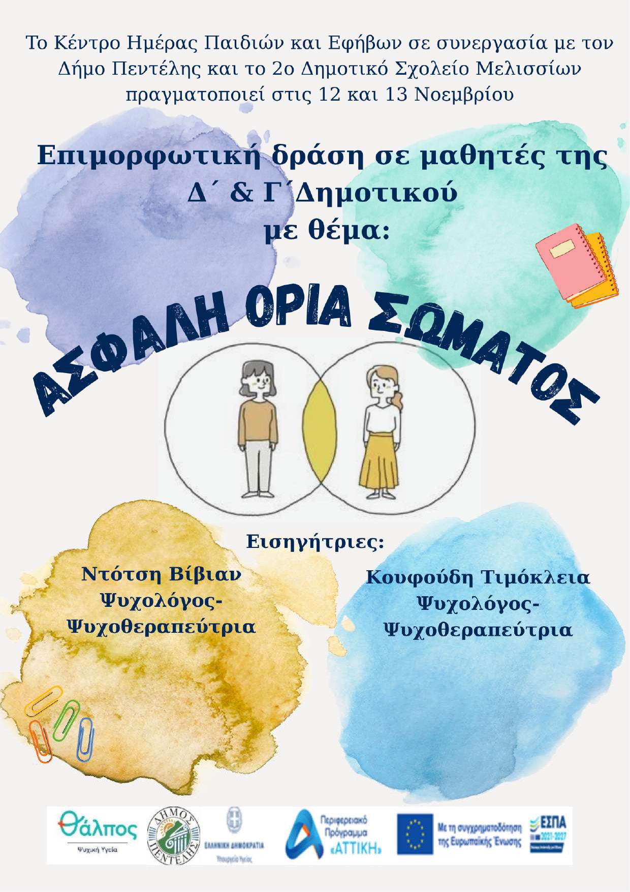 Το συγκεκριμένο εργαστήριο που υλοποιείται 12 & 13 Νοεμβρίου στο 2ο Δημοτικό Σχολείο Μελισσίων έχει σκοπό την εξοικείωση των συμμετεχουσών/όντων στα ασφαλή όρια του σώματος. Η διαδικασία αυτή στοχεύει στην αναγνώριση των προσωπικών ορίων του σώματος και την ενίσχυση της προσωπικής ασφάλειας των παιδιών μέσα από βιωματικές δραστηριότητες και διαδραστική συζήτηση.