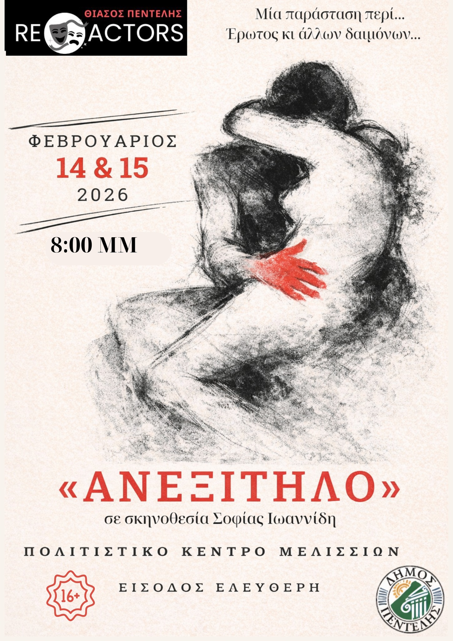Ο θεατρικός θίασος Πεντέλης RE-ACTORS, με ανανεωμένη σύνθεση, επιστρέφει με την παράσταση «ΑΝΕΞΙΤΗΛΟ», σε σκηνοθεσία της Σοφίας Ιωαννίδη, το ΣΑΒΒΑΤΟ 14 & ΚΥΡΙΑΚΗ 15 ΦΕΒΡΟΥΑΡΙΟΥ στις 20.00 στο ΠΟΛΙΤΙΣΤΙΚΟ ΚΕΝΤΡΟ ΜΕΛΙΣΣΙΩΝ.