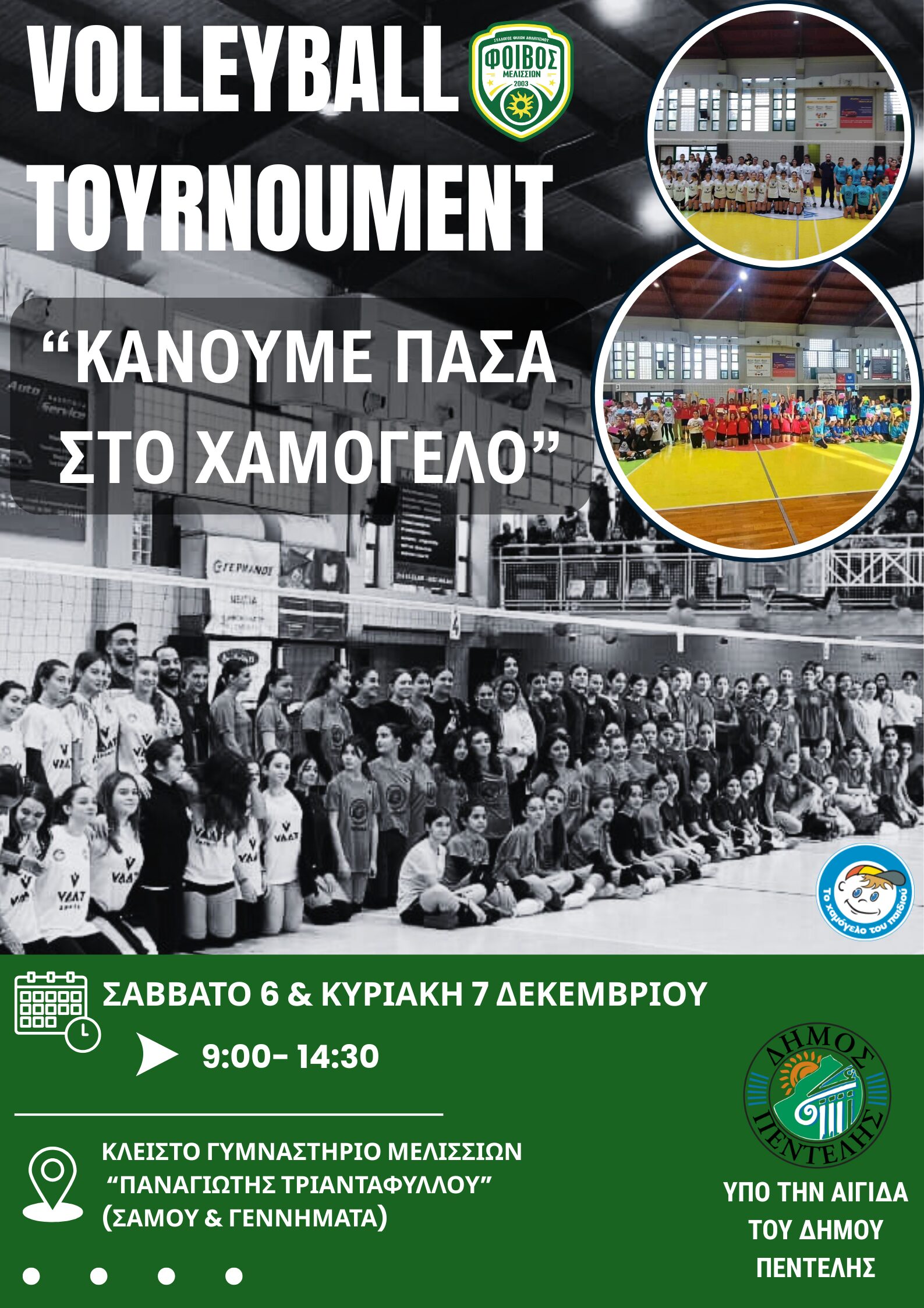 Το Σάββατο 6 και την Κυριακή 7 Δεκεμβρίου, από τις 09:00 έως τις 14:30, αθλητές και αθλήτριες των Ακαδημιών διαφόρων Συλλόγων θα γεμίσουν το Κλειστό Γυμναστήριο «Παναγιώτης Τριαντάφυλλου», σε μια διοργάνωση του Σ.Φ.Α.Μ. Φοίβος, υπό την αιγίδα του Δήμου Πεντέλης, με σκοπό την ενίσχυση του οργανισμού «Το Χαμόγελο του Παιδιού».