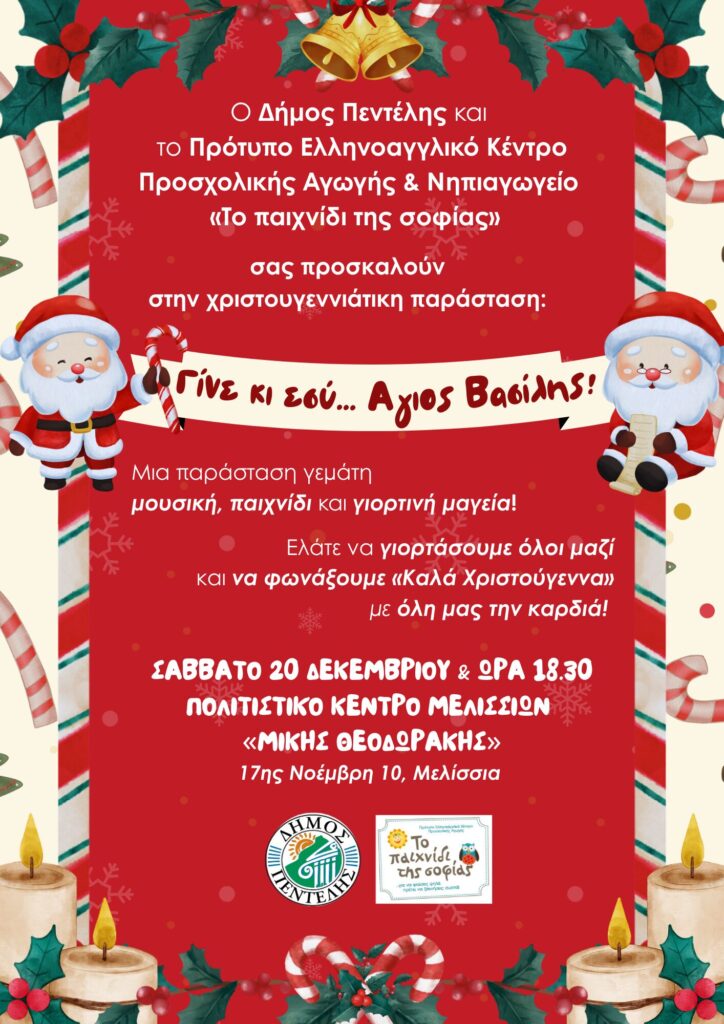 Ένα θεατρικό σενάριο για όλα τα παιδιά της πόλης μας από δύο έως έξι ετών, σε συνδιοργάνωση με το Πρότυπο ελληνοαγγλικό Κέντρο Προσχολικής Αγωγής & Νηπιαγωγείο ‘Το παιχνίδι της σοφίας’, στο Πολιτιστικό Κέντρο Μελισσίων.