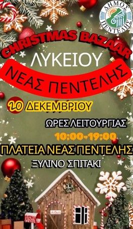 Χριστουγεννιάτικο Bazaar διοργανώνουν οι μαθητές Β’ Τάξης του Γενικού Λυκείου Νέας Πεντέλης με την αιγίδα του Δήμου Πεντέλης , το Σάββατο 20 Δεκεμβρίου, από τις 10:00 το πρωί έως τις 19:00 το απόγευμα, στο Ξύλινο Σπιτάκι στην Πλατεία Νέας Πεντέλης.