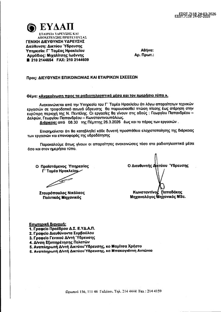 Ανακοινώνεται από την ΕΥΔΑΠ-Υπηρεσία του Γ’ Τομέα Ηρακλείου ότι: