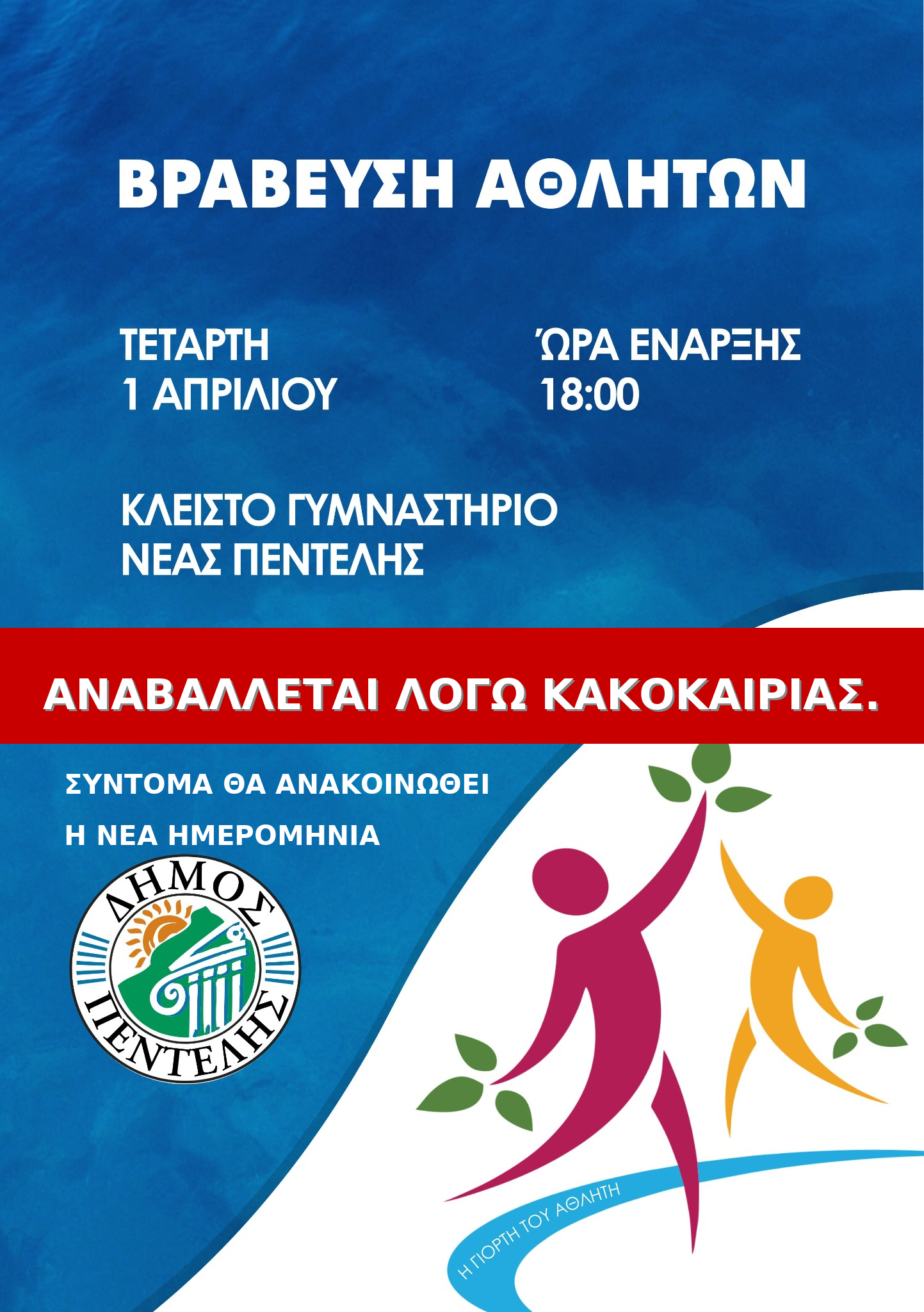 Η προγραμματισμένη Βράβευση Αθλητών, την οποία θα πραγματοποιούσε ο Δήμος Πεντέλης, την Τετάρτη 1 Απριλίου στο Κλειστό Γυμναστήριο Νέας Πεντέλης, αναβάλλεται λόγω κακοκαιρίας.