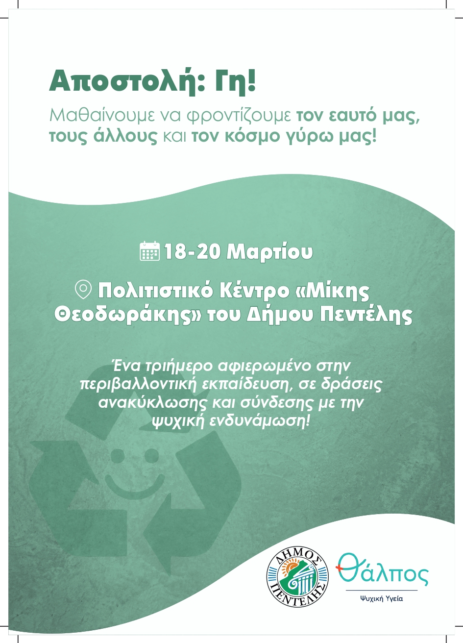 Ο Δήμος Πεντέλης ανακοινώνει την έναρξη μιας καινοτόμου πρωτοβουλίας με επίκεντρο την περιβαλλοντική δράση και την ψυχική ενδυνάμωση σε συνεργασία με τον φορέα «Θάλπος – Ψυχική Υγεία». Με αφορμή την «Παγκόσμια Ημέρα Ανακύκλωσης» στις 18 Μαρτίου ξεκινά ένα ολοκληρωμένο πρόγραμμα που φιλοδοξεί να καθιερωθεί ως ετήσιος θεσμός για την πόλη και να αποτελέσει πρότυπο καλής πρακτικής για την τοπική αυτοδιοίκηση στην Ανατολική Αττική.