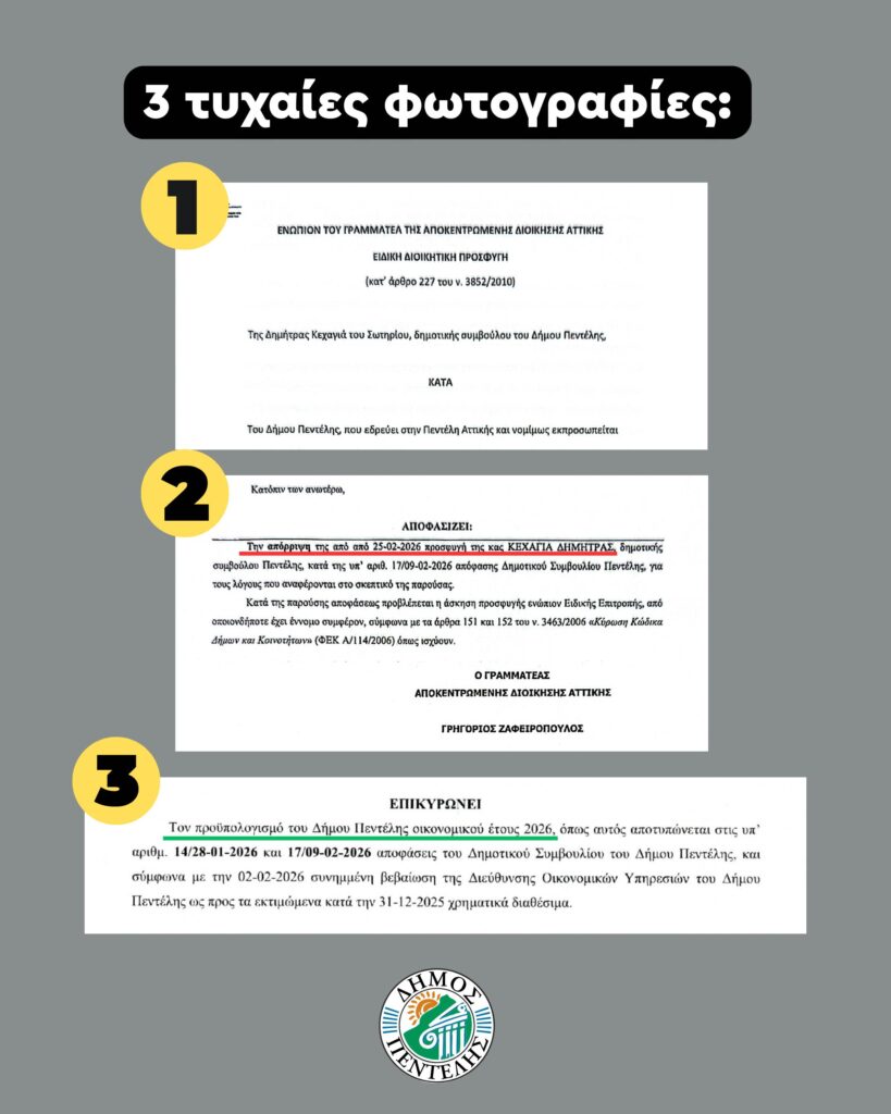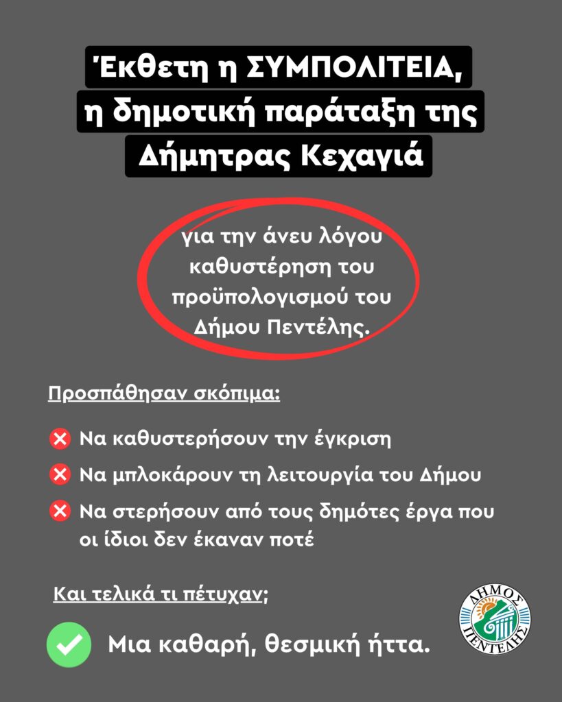 Τις τελευταίες εβδομάδες επιχειρήθηκε συστηματικά να δημιουργηθεί η εντύπωση ότι υπάρχει ζήτημα νομιμότητας με τον προϋπολογισμό του Δήμου Πεντέλης. Η μείζονα αντιπολίτευση και η κα Κεχαγιά επένδυσαν σε ένα αφήγημα αμφισβήτησης, προσπαθώντας να πείσουν τους πολίτες ότι η διαδικασία δεν είναι σύννομη και ότι ο Δήμος οδηγείται σε αδιέξοδο.