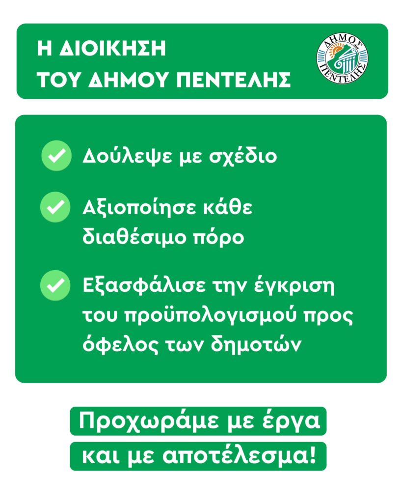 Η διοίκηση του Δήμου Πεντέλης παραμένει προσηλωμένη σε ένα ξεκάθαρο στόχο: να αξιοποιεί κάθε διαθέσιμο πόρο με υπευθυνότητα, να υλοποιεί έργα με ουσία και να δίνει λύσεις σε πραγματικά προβλήματα των πολιτών.