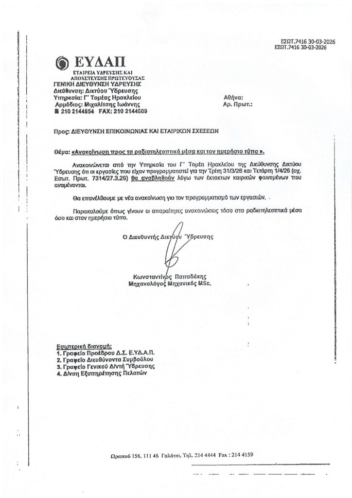 Λόγω των έντονων καιρικών φαινομένων που αναμένονται, η ΕΥΔΑΠ-Υπηρεσία του Γ’ Τομέα Ηρακλείου ενημερώνει για την ακύρωση των προγραμματισμένων εργασιών την Τρίτη 31/3 και Τετάρτη 1/4 που θα επέφεραν υποχρεωτική προσωρινή διακοπή νερού σε περιοχές των Δήμων Αγ. Παρασκευής, Παιανίας, Ραφήνας και Πεντέλης –περιοχή Νταού Πεντέλης συγκεκριμένα.
