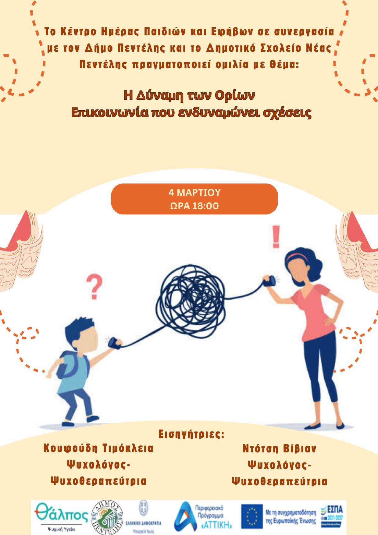 το Κέντρο Ημέρας Παιδιών και Εφήβων ΘΑΛΠΟΣ- Μελισσίων, συνδιοργανώνει με το Δημοτικό Σχολείο Νέας Πεντέλης και τον Δήμο Πεντέλης, την Τετάρτη 04 Μαρτίου 2026, στις 18:00, ομιλία με θέμα:
