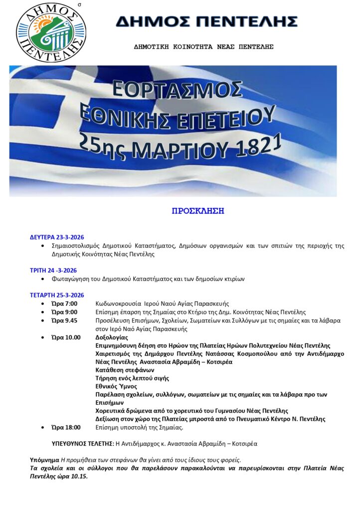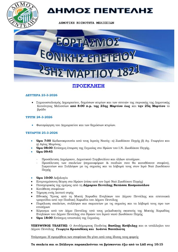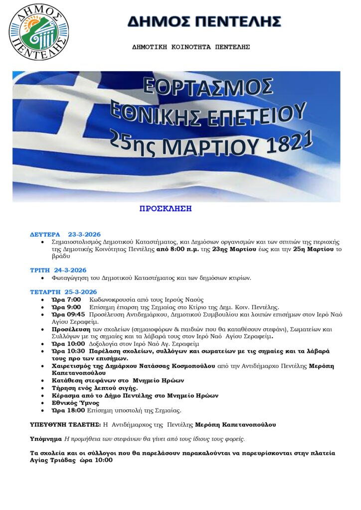 Η διοίκηση του Δήμου Πεντέλης παραμένει προσηλωμένη σε ένα ξεκάθαρο στόχο: να αξιοποιεί κάθε διαθέσιμο πόρο με υπευθυνότητα, να υλοποιεί έργα με ουσία και να δίνει λύσεις σε πραγματικά προβλήματα των πολιτών 23 Μαρτίου 2026