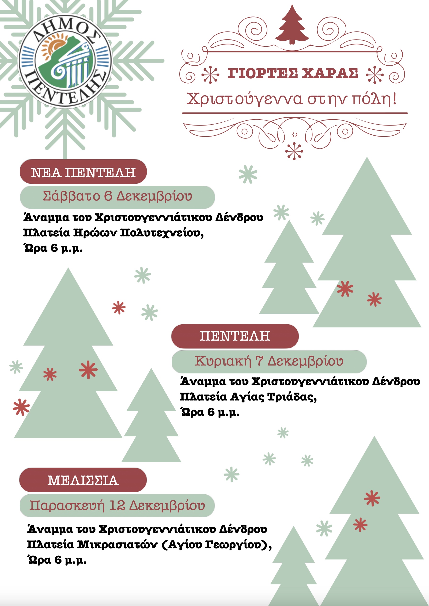 Ακολουθεί αναλυτικά το πρόγραμμα για κάθε δημοτική κοινότητα: NEA ΠΕΝΤΕΛΗ – ΣΑΒΒΑΤΟ 6 ΔΕΚΕΜΒΡΙΟΥ -ΝΕΑ ΗΜΕΡΟΜΗΝΙΑ!! ΠΕΝΤΕΛΗ – ΚΥΡΙΑΚΗ 7 ΔΕΚΕΜΒΡΙΟΥ ΜΕΛΙΣΣΙΑ – ΠΑΡΑΣΚΕΥΗ 12 ΔΕΚΕΜΒΡΙΟΥ